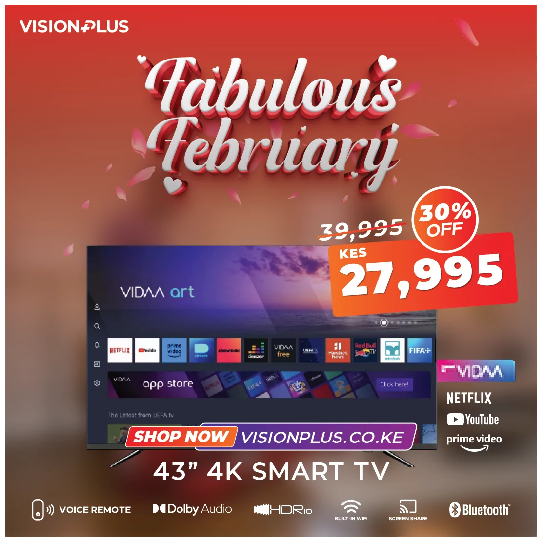 Experience amazing visual clarity with the frameless Vision Plus Smart TV. The TV offers Ultra High Definition (UHD) 4k resolution picture paired with Dolby audio clarity bringing to life levels of colors, immersion, and depth to entertainment.