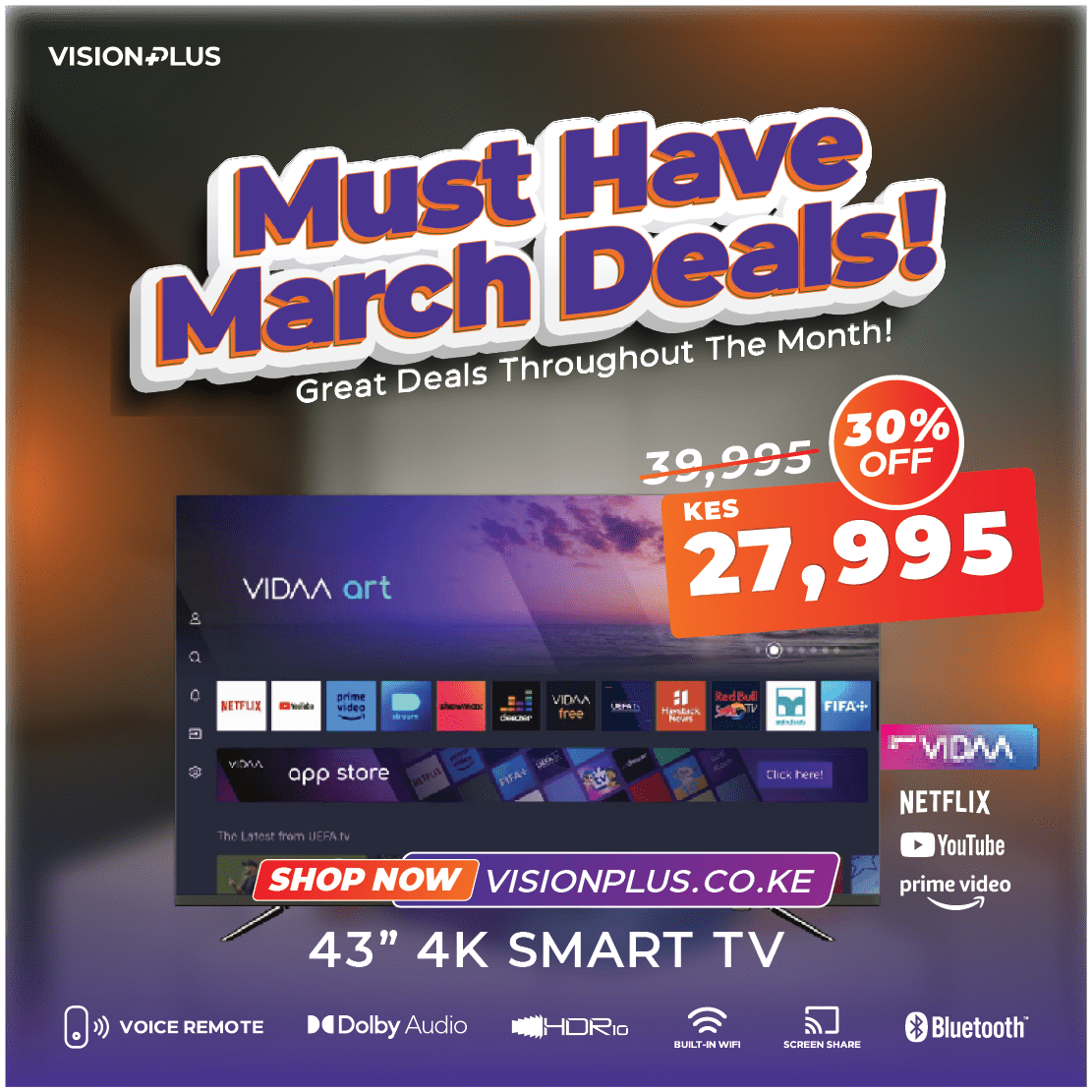 Experience amazing visual clarity with the frameless Vision Plus Smart TV. The TV offers Ultra High Definition (UHD) 4k resolution picture paired with Dolby audio clarity bringing to life levels of colors, immersion, and depth to entertainment.