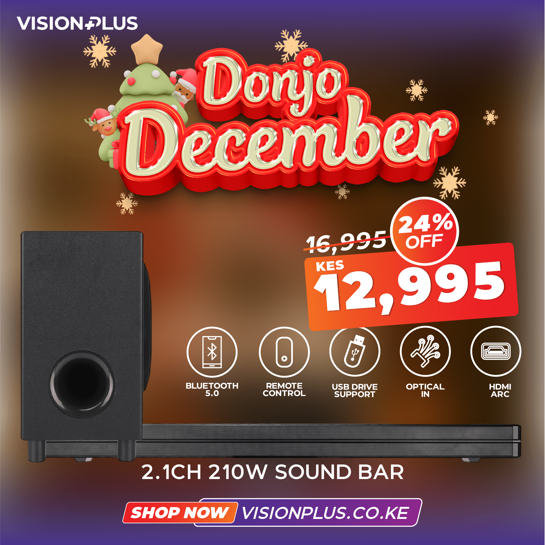 Watch movies and listen to music in style with the Vision Plus 2.1 CH soundbar. This system supports Bluetooth connectivity, and digital FM radio, and comes with USB and audio inputs so you can listen to your favorite songs. Bring the cinema home with immersive and powerful sound.