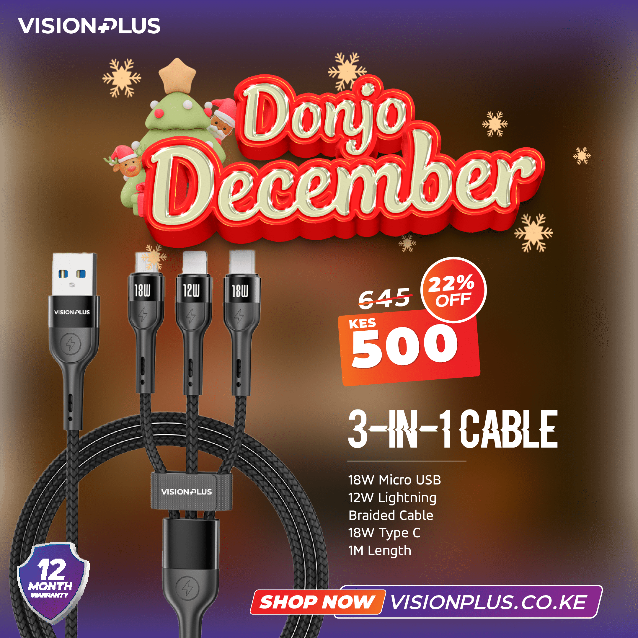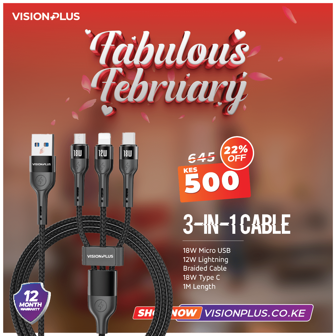Experience top-tier charging with Vision Plus 3-in-1 Cable – delivering 18W High Power and a rapid 3.0A Output Max. This 1m cable, with its high-density braided design, ensures fast charging and bending resistance for ultimate durability. Trust in Vision Plus for a safe, reliable, and effortlessly efficient charging experience.