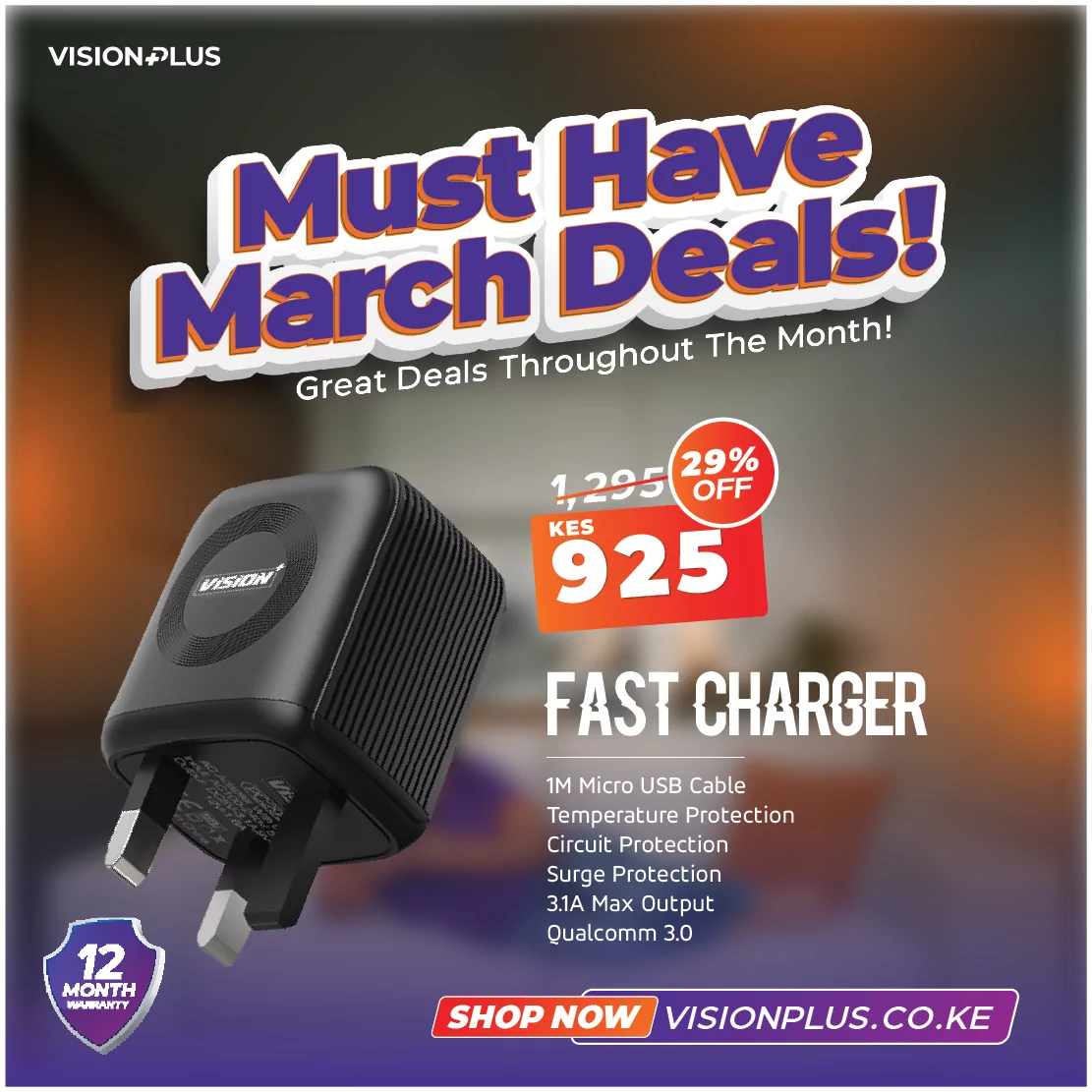 Charge your devices swiftly and securely with our Vision Plus Fast Charger. With built-in circuit, surge, and temperature protection, it ensures the utmost safety. Included 1-meter Micro USB cable and 18W high power deliver rapid charging at a 3.1A output for all your devices.